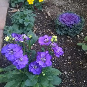 ☆庭のお花達☆ 先日の葉牡丹(デュエット)を プランターに入れてみたら ちょっと寂しそうだったので、 フリルのとタグ🏷️ファミリーの 2株、ピンク系を追加購入、 あとパンジーとアリッサム(白)も 入れ寄せ植えしましたー♪♪♪