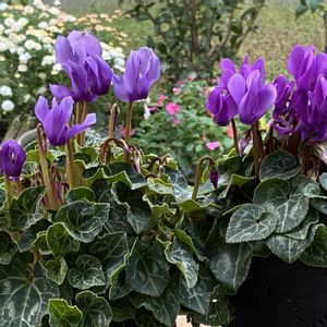 新入りさん♡ 紫色のミニシクラメンをお迎えしました♪💜 初めに右の小さめのディープブルーをスーパーで購入。 先日、ホムセンで左の大きめのライトブルーを購入。 同じ品種なのにこの大きさの違い‼️しかも値段も倍近く違う😳 大きめの方が安いのです💦 ただ、ライトブルーは株が大きいけど、葉組がされておらず花茎が暴れてます💦なのでお安いのかなと😅 枯らさないように気をつけねば😌