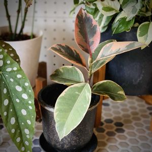フィカス・ルビー🪴ミニ苗お迎えしました。 ピンクとグリーンの色味が絶妙♡ 最近ピンク系の葉っぱの子が立て続けに⭐︎になったので、この子には頑張ってほしい🥹