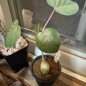 赤玉土単体を買い足しに園芸店へ。 物色してると可愛らしい植物を見つけて確保😁 観葉植物にハマってた頃以来、久しぶりのフィカスをお迎え🌿 今回は塊根植物としてですが(笑) ハート型の葉に赤みのある葉脈、そしてトックリ型の塊根部と、これまた好みな特徴が揃ってて、1000円以下だったんで個人的にコスパ良すぎ👍 久しぶりなフィカス属特有の三角成長点😆 植え替え.春まで待つか悩み中…
