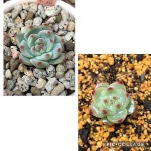 水蜜桃(桃太郎)🍑 左が 子株 右が葉挿しっ子 です🤗 1.5〜2.0㌢だけど 可愛い😍 お母さんは15㌢越えの大株なので これから スクスク成長してって欲しいです♪