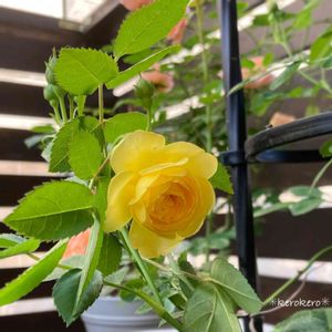 ①二番目に咲いた薔薇は去年お迎えした ベルメールでした💛 ②オベリスクの上の方はまだ蕾 ③④次に咲きそうなマイスタージンガー いちご🍓みたいな蕾も愛らしいです♥️ ⑤この前投稿したスイートドリームも咲き進んでます。 別の写真をプロフ画像にしました☺️
