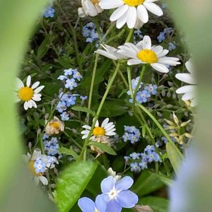 保育所の花壇の花たち ノースポールと勿忘草です。