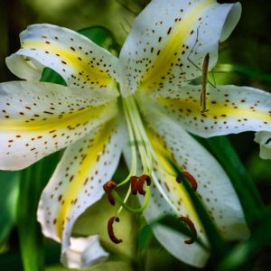 ヤマユリの花言葉:「荘厳」「純潔」「威厳」「人生の楽しみ」「無垢」「甘美」 一昨年、群馬の避暑地から知人が移植した年は7/25頃開花。その後、埼玉に根付いてからは7月の上旬に開花が早まっています😳温暖な(というより暑い)せいなのか? ユリ科ユリ属🌿多年草