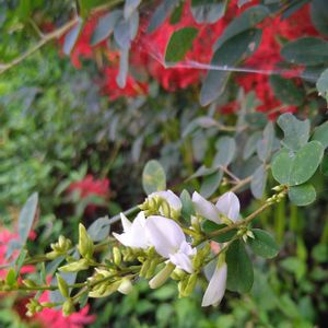 今日のお花🔸ハギ🔸 我が家のハギは白花で、ニホンミツバチの蜜源にと、夫が挿し木で増やして植えたものです🌿 今年は遅くて、まだ数輪の開花です🤍 奥には、ヒガンバナが赤いシルエットに✨❤️✨