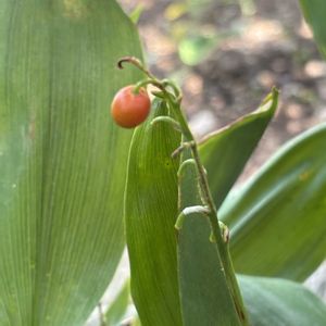ルビー? いえ スズランの実です🌿 真っ白だった花から 宝石のような緑の実が…🟢 熟すと赤く色付きます *キジカクシ科 *スズラン属