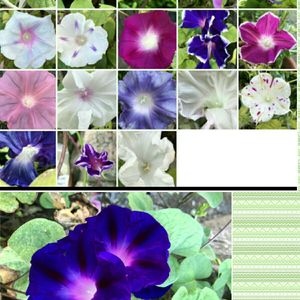 お早うございます。 今朝の朝顔 昨日の丸葉朝顔の蕾は上の段5種類です。 下のシャイニグブルーは車庫の隅っこのコンクリートの割れ目に生えてます。