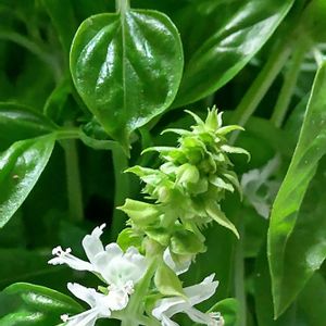 🌿今年は防虫ネットで保護しました🌿 お陰でキレイに成長🌿🌿🌿 花穂が出来 清楚な❀お花❀が咲き始めました❀ ❀🌿❀バジルのお花❀🌿❀ バジルの花言葉 「何という幸運」 和名 「メホウキ (目 箒)」
