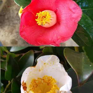 椿(ツバキ) 我が家の椿は「夢」以降咲き出さないので、近所のお稲荷さんに植えられている椿です。 近所と言っても人目に付きにくく、めったに行く事も無い所。 藪椿があるのは知ってたけど、白椿(加茂本阿弥 -かもほんなみ- かなぁ🤔)があるのを初めて知った‼️ 何十年と住んでいてお恥ずかしい😅 取りあえず紅白めでたく咲いていたのでパチリ📱