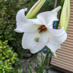 百合 昨年お隣さんちの庭にイッパイ咲いてるのを2本頂いたのが咲き始めました🤗 タカサゴユリなのか、シンテッポウユリなのか、よく分かりません😅 区別もなかなか難しいらしい。色々調べてもこれといった決め手が無くって…🤔 もう、ただの白百合と言っとけばいいか!😁