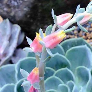 絵に書いたような七福神の花芽 とても綺麗なピンクと黄色💛 でもその後、ナメクジ? 七福神さんかなりたべられてます😤 やはり地植えは難しい😭