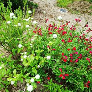 千日紅とチェリーセージ🎵 夏の紅白の花に癒されます☺️ 千日紅はドライフラワーにしたいです😊