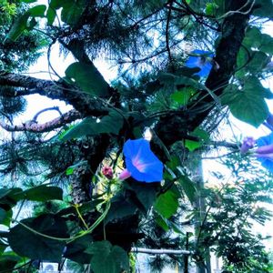 今朝の散歩道です。 みさと公園から私道へ出て、松の木に朝顔が絡んでいました。