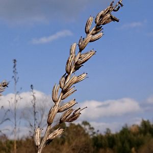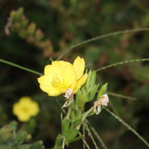 雌待宵草(メマツヨイグサ) 道端や空き地、河原などに生えるアカバナ科マツヨイグサ属の2年草。明治時代中期に観賞用として渡来した北アメリカ原産の帰化植物。夏から秋にかけて茎の上部の葉腋に黄色の4弁花をつける。夕方、わずか1分半で花開く。甘い香りと蜜で蛾を誘い花粉を運ばせる。花粉は粘着糸という物質でつながっており、花の蜜を吸う蛾の口吻につまとわりついて一度に運ばせる。花は翌朝しぼみ、カプセル型の実に生まれ変わる。 晩秋、立ち枯れた茎に実が並ぶ。実の1つ1つに100~200粒ほどの小さな種が詰まる。実の先端が裂けて開き、高さ1~1.5mほどの枯れ茎が風で揺れると種をまき散らす。種は条件が揃うと芽を出し、地表にロゼット形の葉を広げる。そのまま越冬して1~2年後に花を咲かせ実を結ぶ。条件が揃わない場合、雌待宵草の種は80年以上も発芽能力を保ったまま眠り続けることができる。 待宵草の仲間は夕方から咲き始め、翌朝にはしぼんでしまう。夜を待って咲くために待宵草という。この仲間は全て外来種で日本在来種はない。幕末から明治時代にかけて順に月見草、待宵草、大待宵草、雌待宵草(荒地待宵草)、小待宵草が渡来した。雌待宵草は待宵草より小さいことから雌がついた。 出典『種子たちの知恵』『野草の名前』