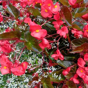 真っ赤なベゴニアの花と濃い葉っぱ そして 脇のユーフォルビア ダイヤモンドフロストの白とのコントラストがとっても綺麗です。 丈夫で育て易く 春から秋まで長期間花を楽しめるので 夏の花壇やコンテナの定番ですね。🤗✨ ブラジル原産。 シュウカイドウ科ベゴニア属の多年草。