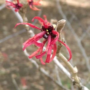 今日のお花 アカバナマンサク(赤花満作)は マンサクの品種の1つです。 とっても地味で目立たない花ですね。 4枚の萼に支えられた細長いリボンのような花びらが4枚絡みながら垂れ下がっています。更に よく見ると黄色い4つの雄蕊と小さな雌蕊が真ん中にあるのが分かります。 赤い花を咲かせるマンサクの仲間には ベニバナトキワマンサク(紅花常磐満作)がありますが アカバナマンサクが落葉なのに対しベニバナトキワマンサクは 常緑なので 花期の葉の有無で見分けられます。🤗✨ 北海道 本州の日本海側原産。 マンサク科マンサク属の落葉小高木。