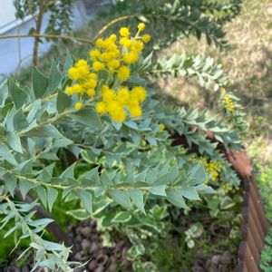 こんにちは。 地植え3年目 三角葉アカシア 初めての花が咲きました。 手のひらサイス苗からです。 うれしいなあ。