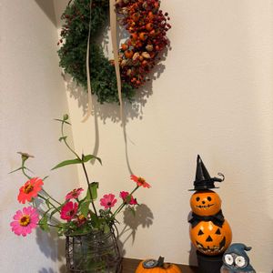 今月の教室は実物リースでした❣️ 🎃ハロウィンカラーで実物がぎっしり重いリースです ローズヒップ 野バラの実 ゲツトウの実などでリース半分ヒムロスギ半分で完成このままクリスマスまで持ちそうです💕 玄関をアレンジ ちょっとハロウィン気分で🎃