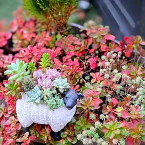 🌈 カラフル 🌈 1⃣紅葉が綺麗なセダム 実生のコノテヒバが丘の上の一本の木🌳のようでいい感じ♬.*゚ 花ともさんからいただいたサフォーク種の羊さん🐑寄せ植えのプロリフェラの紅葉🩷 にキュン(*´`)♡ 2️⃣炎の様に紅葉🍁したコキアにイタズラ書き ( ´罒`*)✧" 3️⃣常山あじさい(碧の瞳)に実が成りました💙