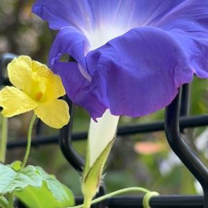 こんにちは♪ 今朝は朝顔と隣りに植えたゴーヤの花が隣りあって咲いてます 💙暁の海💙 💛ゴーヤ💛