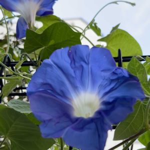 おはようございます♪ ♡今日のお花♡ 💙朝顔(アサガオ)💙ヒルガオ科 昨日から💙暁の海💙が咲き出しました 大輪で濃い青色が綺麗で、葉は斑入りで涼しげですね 一緒に買った暁の夢はまだ咲いてないです(團十郎に白の覆輪がついてます)