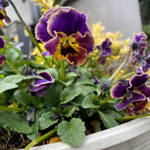 秋に鉢植え🪴したビオラです。 何度か雪にに埋もれましたが、しっかりしてます🥰 寒さにビオラ強いです😆🎶 春暖かくなって、株が増えていくのが楽しみです。 ちょっとフリフリの花弁もお気に入りです💕