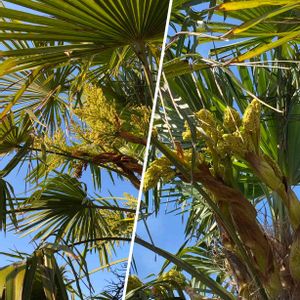 今日はとってもいい天気☀️✨✨ たまたま同じ様にピカピカのいい天気でしたが、右はちょっと前に撮ったものです。 左が今朝の様子です。 初めてシュロの花に気がついた時はびっくり😳、なにものがでてきたんだろう❗️と思いました😆 今年は大雪でしたが、その雪にも耐えて今年も花🌼を咲かせてます❣️