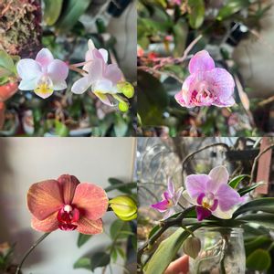 胡蝶蘭咲いてきています(^^) 名無しの子がほとんどです。 右上 蕾から傷があったからか綺麗に咲きませんでした💦他の蕾も落ちてしまい一輪だけ咲きました。 左上 流木に付けた3.7センチくらいの小さい胡蝶蘭 左下 毎年咲いてくれるオレンジ色の胡蝶蘭 花の大きさは大きめの7センチ 右下 水耕栽培にしている4センチほどの小さい胡蝶蘭も咲きました