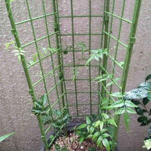 お隣さんから頂いた 挿し木のジャスミン なかなか伸びなくて、 ダメかな~と思って放置してたら、 真夏の暑さに負けず グングン成長中 上に向かう蔓を横に誘引(笑)