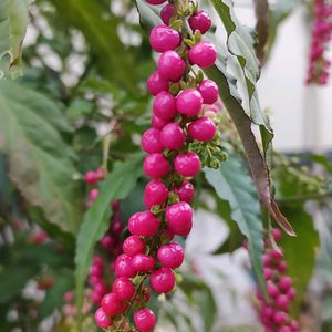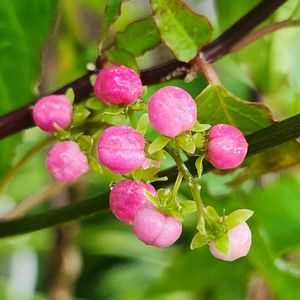 ジュズサンゴ桃玉 ①ピンクの実がかわいい~🩷🩷 ②色付く前の実もかわいい~💚💚 ③白い花もかわいい~🤍🤍 ④こぼれ種から出てきた新芽もかわいい~🌱🌱