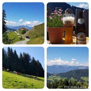 オーストリア•アルプス山 、休憩編 (最後。お付き合いありがとうございましたm(__)m) 気を引き締めながらの下り道から、安心する道に到着。でも、まだ標高約1500km。 ようやくレストランロッジが見えてきました!この頃、足がプルっとしてきたとこ💦 よい景色を見ながら、休憩🍺(ノンアルコール) その後は、まさかのゴンドラなしで麓まで、蛇行砂利道を降りていきます😆 もう、最後は足?膝?が笑って笑って力が入りません。 日頃の運動不足が、、💦 翌日から、数日間、筋肉痛で、 特に下りが、階段の下りが、、(ノД`)ノヒィ 途中、知らずに近道を行きましたが、急に急斜面になり、面白い反面大変でした。 木の根っこが階段がわりになって、 よかったです。 その時、近くにいた牛たち。 オーストリア•アルプス編は以上です😃 私たちが行ったところは、アルプス山脈の中でも低いので、子連れのハイキングにはちょうど?よかったです♪