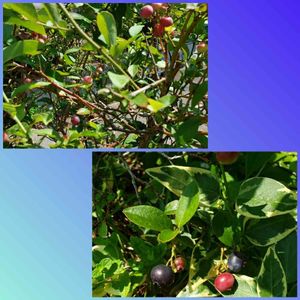 うちのブルーベリー いつもは大粒の実がなるのですが、、、 今年は長梅雨か、選定の仕方の悪さか?🤔で、 下の方に少し熟したのが何粒かありますが、あとは赤いまま…⤵️ 肥料やってないのも関係あるかなぁ~~(T^T)