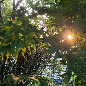 モミジ? カエデ?🤔 まだ緑です。 いつ頃色づくかなぁ~~🍁 夕陽が射し込み シルエットがよかったのでカシャリ🤳)))