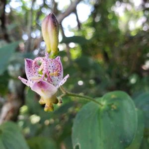 木の陰で、涼しげに咲き始めました。 花の下に、丸いものが付いているのは、 台湾ホトトギスでしょうか……🤔?