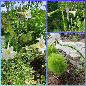 テッポウユリかな? オニユリさんとバトンタッチ 勝手に生えてきて、立派に咲かせます。 ブルーベリーの木の中に、ラベンダーの後ろに、、、、 コキアの子守り役も🤭