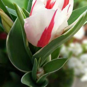 チューリップ🌷 バレンタインレッド 今年🌷は不作です😭 手前に小さいのがあるけど、期待薄いね 葉っぱの回りが白く縁取りになってるのもお洒落ね😃 6個植えたのに😭 葉っぱばかり茂ってるゥ❗