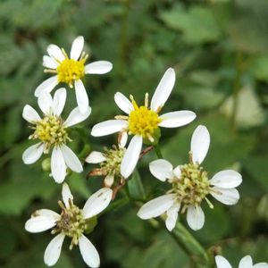 雑木林の空が見えるところ 丈1.5mほどに伸びた シラヤマギクが咲いていました。 白いまばらな舌状花と 黄色い筒状花からなります。 葉っぱはざらざらします。