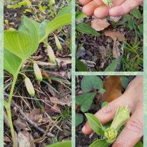 ホウチャクソウ(宝鐸草) ユリ科チゴユリ属 ニリンソウやウラシマソウの生えている山の中に沢山生えています。 ニリンソウの開花を見に 何度も通いましたが、このこもいつパッと開くのかと待っていましたがこれが限度のようです😱 こんな状態のがアッチにもこっちにも、、、。 名は寺院の仏堂や塔の軒に吊るされる宝鐸ににているところから 茎は上部で枝分かれし、葉は卵状楕円形で先は尖り、平行した3本の脈がある。 花は6枚の花被片からなり3cm程のが枝先に1~2個、下向きにつく。咲き始めは緑色だが次第に白くなり先端に緑が残る。 AIはアマドコロと回答する!🤷