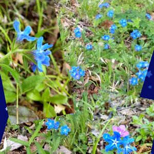 ホタルカズラ(蛍蔓) 別名ルリソウ、ホタルカラクサなど ムラサキ科ムラサキ属 フデリンドウを撮ろうとしてると 👲「おばあちゃん! こっち来て!青いお花がさいてるよー。」 と呼ぶので行ってみると🧓「わぁー!すごいねぇ~」 鮮やかな青い(紫がかったピンクの花もちらほらありました)花が沢山咲いていました。 真ん中の☆が螢の光を連想させるところからついた名だそうです。 茎が地面を這って伸びるつる性の植物で、 咲き始めは赤紫で徐々に青く変わっていくようです😃