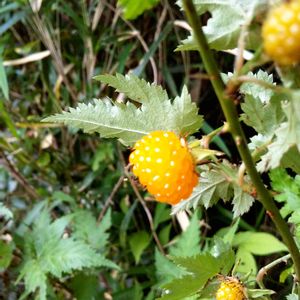 カジイチゴ 山林から抜け出そうと 降りられそうなところを捜していたら 掴んだ枝に木苺! やったぁ😃✌️ 刺は無かった 黄色い苺 食べたら悪いかな?と思って食べなかった 今度まだ実があったら 食べてみようっと🤗