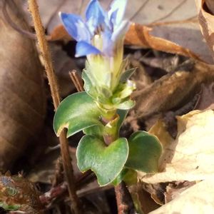 ( -_・)?🙄😳 ら、り、り、り りんどう? 山の中の斜面、湿った落ち葉の積もったところから、青い花が顔を出していました😃 春にも咲くの? 添い寝をするようにして撮りました。