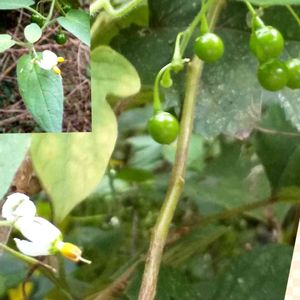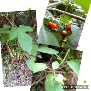 ツルハナナス(蔓花茄子) でしょうか? いえいえ「ヒヨドリジョウゴ」でした。😲 イヌホオズキにそっくり! 刺はありません。 でも草丈が2mはあるかと思われます。 蔓状でそばに生える木に絡まっています。 実の色の変化を待ちたいと思います😃