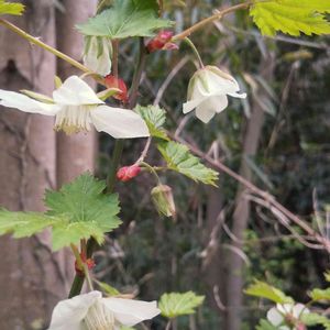 モミジイチゴ (紅葉苺) バラ科キイチゴ属 スッキリさっぱりしてしまった林のなかに うつむいて咲く 浅い👒のような白い花を 紅い冬芽がひきたてます。