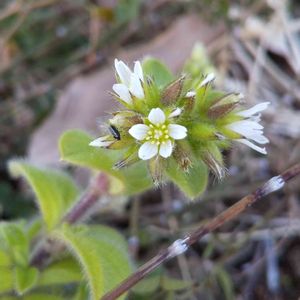 枯れ草の中で小さな白い花が目を引きます😃 ミミナグサとしましたが*花柄が短くほとんど茎に接している *花が閉じた時花弁が萼片からはみ出る の点から オランダミミナグサに訂正いたします🙇 ミミナグサに👍️くださった方ご免なさい 🙇💦💦