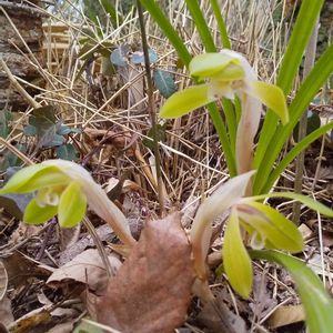 シュンラン(春蘭) ( v^-゜)♪ やっと花を見せてくれました😃 いつもの雑木林ですが昨年から伐採が行われており、シュンランのすぐ側にも切り倒されたままの木があるので、これが運び出される時に下敷きにされたり踏まれないかとヤキモキしておりました😅 とりあえず、お顔が見れて良かった🤗