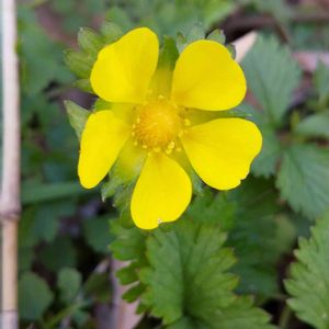 キジムシロ(雉蓆) バラ科 キジムシロ属 ヘビイチゴだとつい先日までおもっていました😲 今年咲きだしたのを見つけてあらためて良く見ると ⬆️副萼片(外側)が萼片(内側)と同じ様に尖っています (蛇苺の副萼はギザギザのある葉が5枚) ➡️葉っぱも小葉が5枚(5~7)の奇数羽状複葉 (蛇苺は3小葉) 茎も赤色をしています。 以上のことから キジムシロとわかりました。 ちなみにこちら、ヘビイチゴの実ように赤くはなりません。