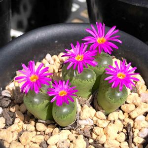 毎年、このオフタルモフィルム(現在はコノフィツムに統合)はとてもよく、咲いてくれます。 よく、どうすれば咲くか訊かれるのですが特別なことは、何もしてないんですね。うちの栽培環境がオルタルモにきっと合っているのでしょう。 参考までに下に、コメントしたときの、コピペを貼っておきます!↓ ─────────────────────── オフタルモ系の好む環境は、その他のコノフィツムより、生育期はかなり日当たりと風通しを好む印象です。 うちでは一年中、雨よけ無加温の屋上温室で、生育期は風と日光マックス(冬の夜は扉は閉める)、休眠期は遮光して(私は銀の寒冷紗を使っている。暗くなりすぎない)水やりストップ。 屋内などに置いては、まず花は咲かないです。生育期とは現地の南アフリカは冬が雨期なので涼しい時期、つまり秋のお彼岸~GWぐらいまでですが、異常気象が続いているので、臨機応変に。 私は休眠期(暑い時期)には、水は一滴もやりません。これを暑いからかわいそうだといって、現地がどのような環境なのか調べもせずに水をやると腐る原因です。 オフタルモは長いほうの幅と高さが同じぐらいのプロポーションが理想。それ以上延びているのは、明らかに日光不足、水のやりすぎ、風通し不足。 シビアかもしれないけど、最後に! 植物は生き物です。インテリアや飾りものではなく「生きて」いるのです。でも、その場を動けないので、栽培環境を整えるのは栽培者の責任と使命です! 「かわいい、きれい」だけで買ってはいけない!そんな甘くないぞ!ちゃんと現地環境や生育サイクルを、勉強してからにしなさーい!!