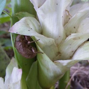 ウコンの花はどうなったかな🙄と覗きに行くと 蝉の脱け殻がくっついていた🤳 帰宅してupしてビックリ なんと! お目👀が光ってる✨