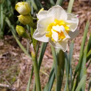 畑の周りに積まれた草木のゴミの中から生え出た フサザキスイセン A「あ~首 痛っ😞💥」 B「あたしは目がショボショボ~😣」 C「んもう~、オタク達スマホの見すぎよォ!」「ほらほら、背筋伸ばして遠く、近く、手元って目ん玉動かす!」