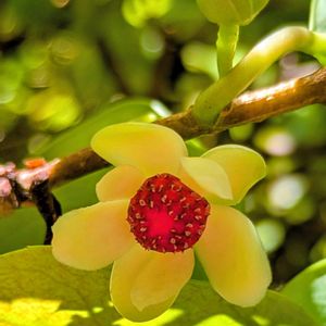 今日のお花 1️⃣雄花 クリーム色の花びらに 中は いちごの様な紅色🍓 2️⃣ 雌花 こちらは淡いクリーム色に 中は淡いミントグリーン まるで メロン🍈 3️⃣実🟢 可愛い🟢が並んで球形に 1️⃣〜3️⃣は過去pic 4️⃣ 紅く熟した実🔴 色々な姿に結実 今年はまん丸は 少ない 5️⃣熟した実後 なんだかいちご飴の様で 甘い 香りがしてきそう😋💕 紅葉も素敵ですが 5枚になってしまいましたので 葉っぱの発表会に投稿しようと 思います🙂
